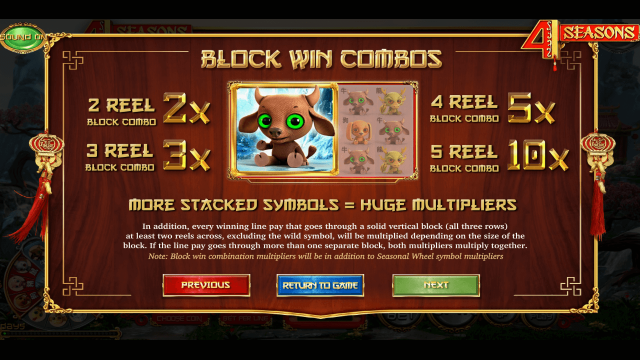 Виртуальный слот 4 Seasons наделен фриспинами, спецсимволами и рисковым раундом. Отличительная особенность автомата — «Сезонное колесо», которое закрепляет множители за несколькими символами. Максимальная выплата онлайн-аппарата — 750000 кредитов.