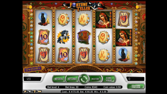 В игровом автомате Гадалка 5 активных барабанов, 30 рабочих линий, спецсимволы, бонусный раунд и автоплей. Диапазон ставки — от 1 до 5 монет, стоимостью от 1 до 50 центов. Выбрать размер ставки пользователь сможет самостоятельно. Новичкам стоит начинать с минимальной суммы.